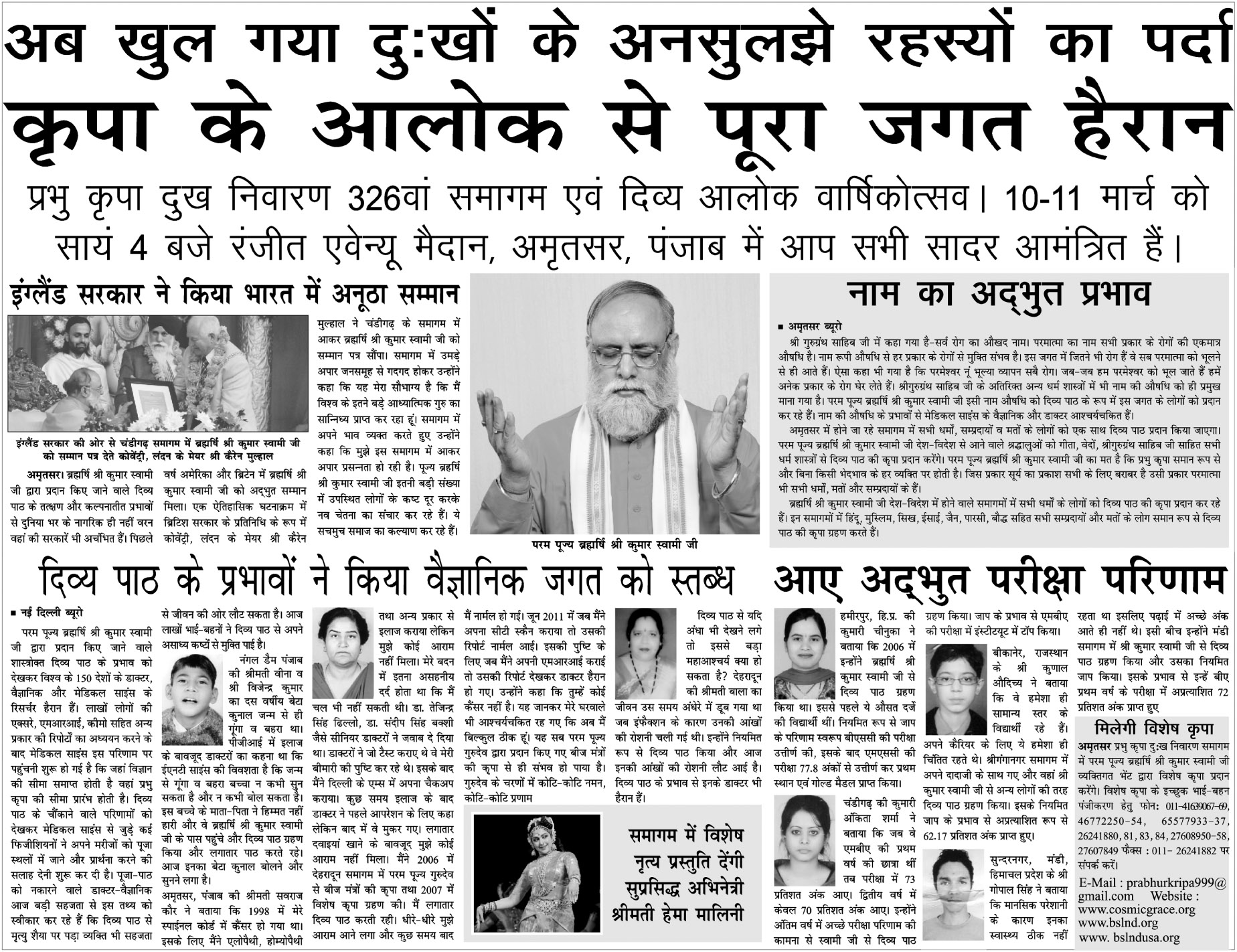 स्वामी जी ने कहा कि अभी हाल में न्यूयार्क सीनेट एवं यूके की पार्लियामेंट में उन्हें मिला विशेष सम्मान उनका व्यक्तिगत नहीं बल्कि भारत की पुरातन मर्यादा का सम्मान है। आज पूरे विश्व में करीब 50 करोड़ लोग बीज मंत्रों का नित्य नियम से पाठ कर लाभ अर्जित कर रहें हैं। गुरुदास ने बताया कि रविवार को प्रसिद्ध सिने तारिका हेमा मालिनी बालकृष्ण लीलाओं का मंचन करेंगी। समागम में रामायण, महाभारत सीरियल के कलाकार भी भाग लेंगे।
